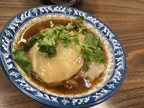 店家的肉圓是蒸的,醬料帶著一點甜與鹹,